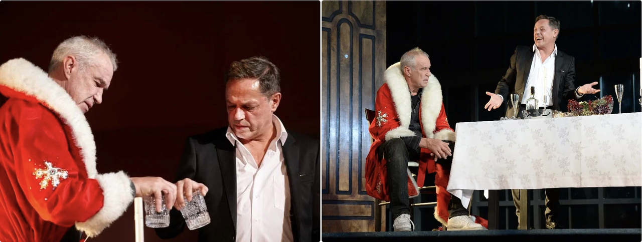 И Вас с Наступающим… История случайной встречи двух однокурсников на лестничной площадке, в последний час уходящего года. admin, 11.06.2024 Сергей Гармаш и Игорь Скляр в «новогодней», но абсолютно внесезонной истории случайной встречи двух однокурсников на лестничной площадке, в последний час уходящего года. Один – герой глянца, успешный шоумен. Другой даже за униформой артиста-неудачника — костюмом Деда Мороза — не в состоянии скрыть свою потрепанность жизнью. Один — надежда курса, чьему таланту откровенно завидовали. Второй – из середнячков. Что важно, симпатии они друг к другу никогда не питали. Такая встреча могла бы закончиться чем угодно — холодным кивком, конфликтом, даже дракой. Чем угодно, но только не… новогодним фейерверком. Без рубрики